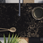 Black quartz’s rich depth makes it incredibly versatile when paired with flooring; light wood floors create a striking contrast that brightens the room and highlights the worktop’s onyx-like sheen, while medium or dark woods are perfect for creating intimate, cocoon-like kitchen spaces. Natural stone flooring can echo the quartz finish, and large porcelain or ceramic tiles in neutral greys, ivory, or even subtle geometric patterns add interest without competing with the worktop.