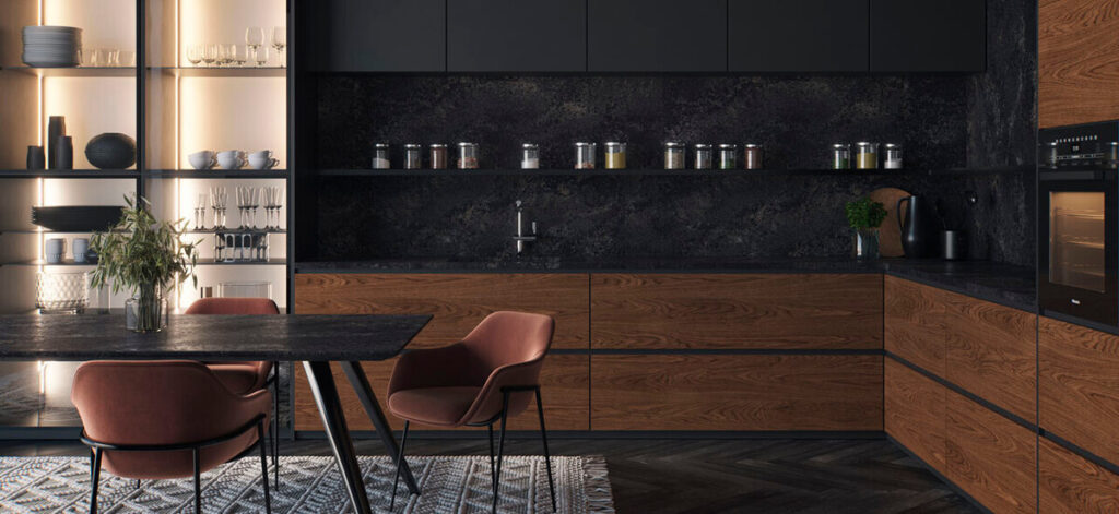 Or, for a bold contrast, offset the darkness of your new black quartz worktop with warm, timber finishes and jewel-toned accessories for an inviting, dramatic look.