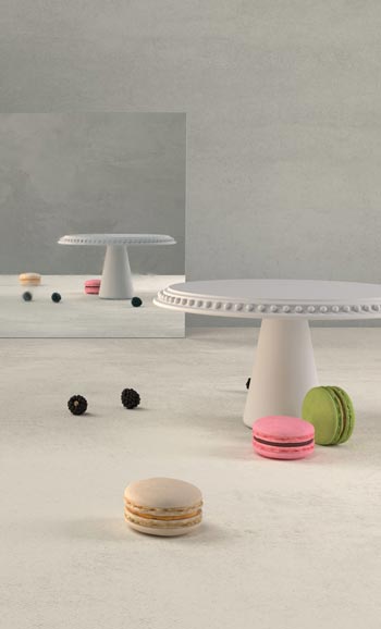 A whitewashed surface softly echoing the patina of concrete and covered with a hazy imprint of a subtle mesh, cloud-like in its warm white presence