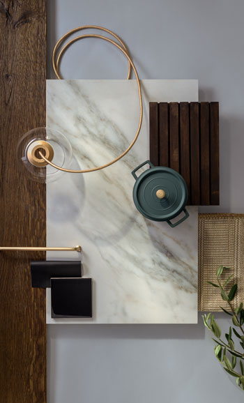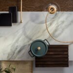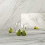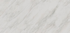 A soft ivory-white base subdued by a striking flow of grey veins that dissolve into the stone, accentuated by muted green and yellow crystalline layers for an authentic mineral effect, capturing the clouded translucency of marble, in a Honed finish