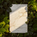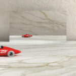A veiled surface comprising an ivory base mixed with washed clay in a bold and complex metamorphic structure, densely traversed by wide charcoal and grey veins floating across it like clouds with copper accents, creating the opaque depth of hard marble with the soft translucency of alabaster, in a Silk finish.