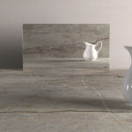 A smoky grey base weathered like a rock and fossil-like, a geological landscape that comes to life as a surface, its strong earthy presence reflected in a complex structure of fine dark veins at the centre alongside more prominent lines in other parts, emphasised by patina stains, rusted silt, chalky-white streaks, and burnt orange markings, in an Ultra-Rough finish.