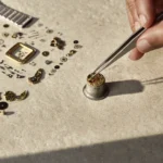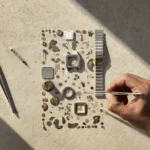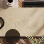 A dry neutral base infused with ivory and beige granules, like fine particles of sand and crushed shells that morphed into an ancient stone over millennia. Mottled highlights and brown scuffs evoke the rugged appearance of a humble sedimentary rock, in a Stone finish.