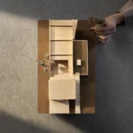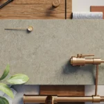 A neutral grey with a richly detailed granular aesthetic made of tiny shells, grains, aggregates, and impurities, fused into an elaborate archaic texture of tone-on-tone fossils. Warm grey and cashew are speckled with small moss rings and darker stone-washed dashes, in Stone finish.
